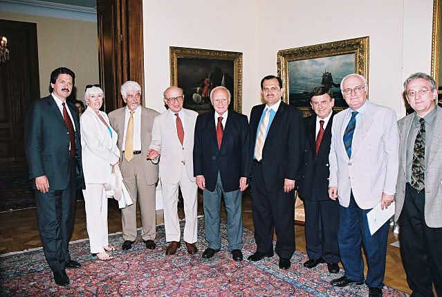 (L-R) Kosats Alexakis, Erika and Ted Spyropoulos, Gene Rossides, President of the Hellenic Republic Karolos Papoulias, Nick Larigakis, Prof. C.G. Alexandrides, Ilias Malevitis, and Elias Papadopoulos.